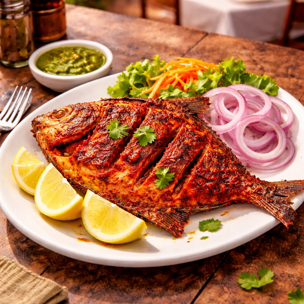 Recheado (from the Portuguese rechear, to stuff) is a scarlet masala of Kashmiri chillies, garlic, ginger, cumin, cloves, cinnamon and palm vinegar, applied generously inside a scored whole fish — usually pomfret or mackerel — before it is pan-fried until the exterior caramelises and the inside stays moist and deeply flavoured. The masala paste itself is sold in every Goan market and is one of the best edible souvenirs to take home.