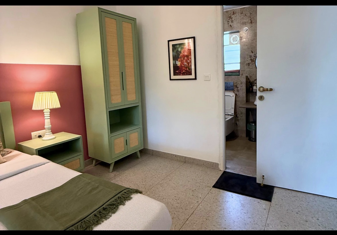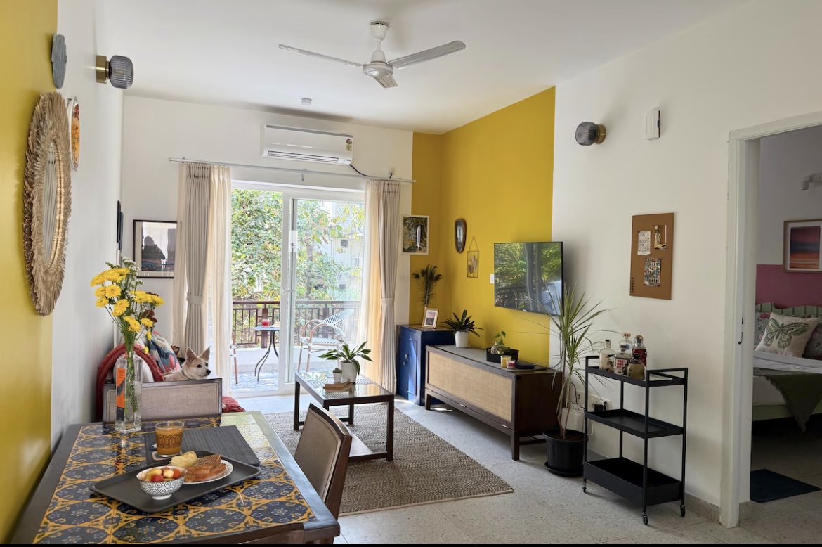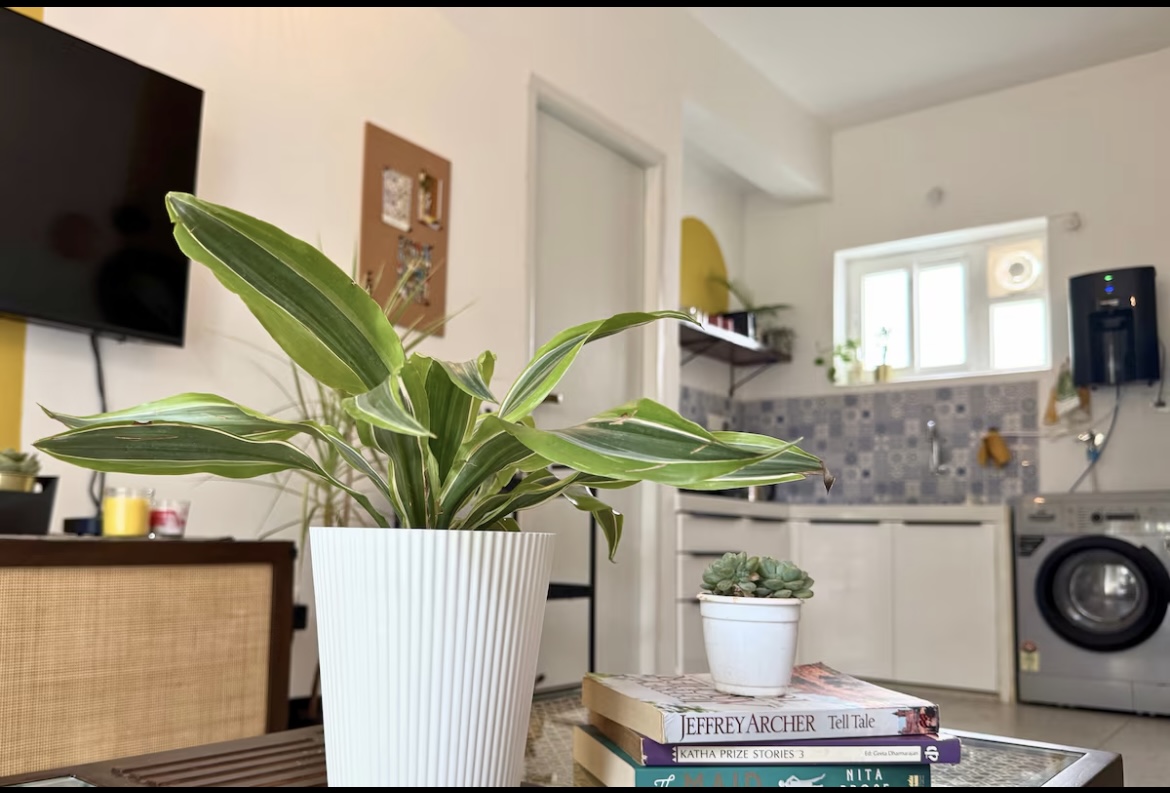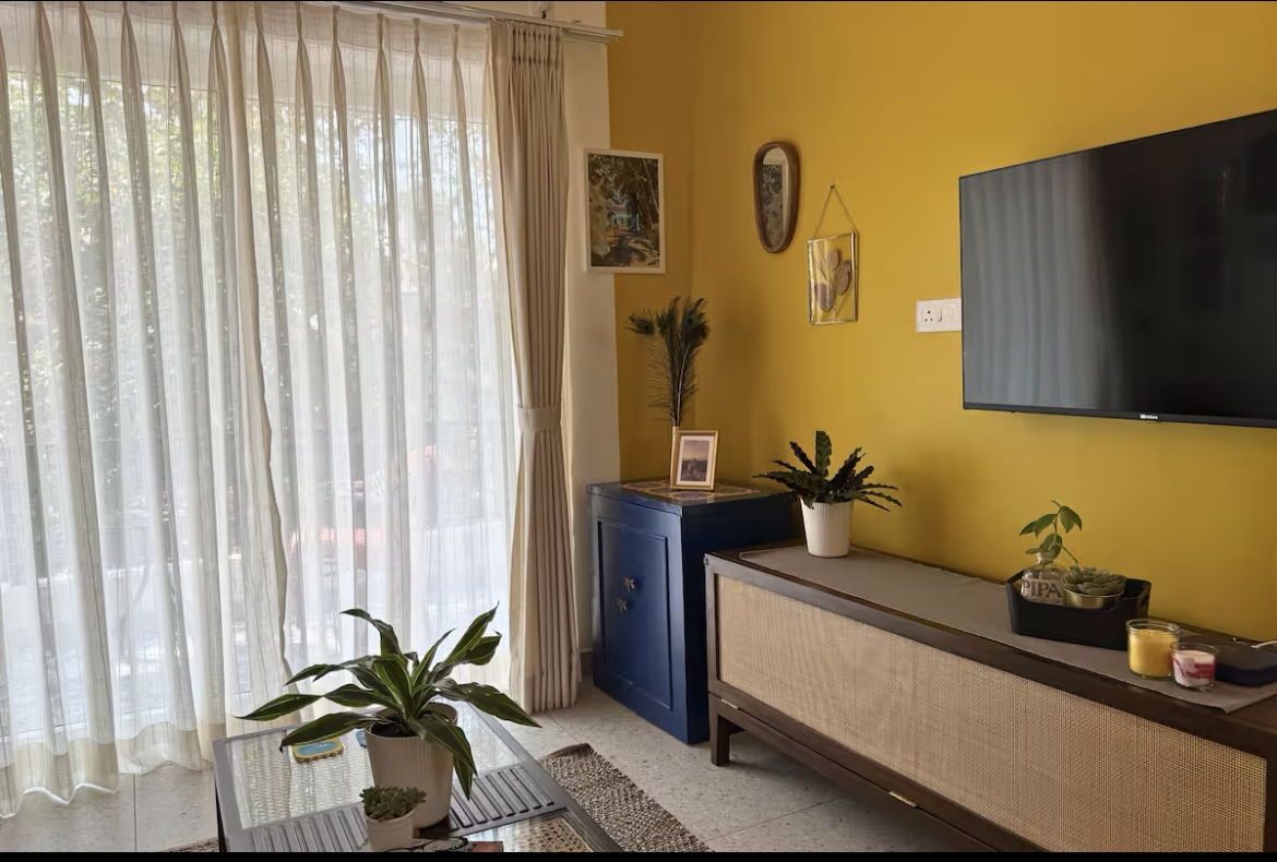 Dream-Chill-Soak-Unwind! A sun-kissed sanctuary where light lingers, breezes whisper, and warmth feels like home. Bright days turn into cosy evenings, with pretty lights adding charm. The airy living space has plants, a TV, AC, high-speed WiFi, and all the essentials. Set in a beautiful apartment complex with lush trees and a serene pool, The Beehive offers a peaceful escape while keeping you close to Goa’s vibrant charm.The bedroom is calm & tranquil with a beautiful view out the window.