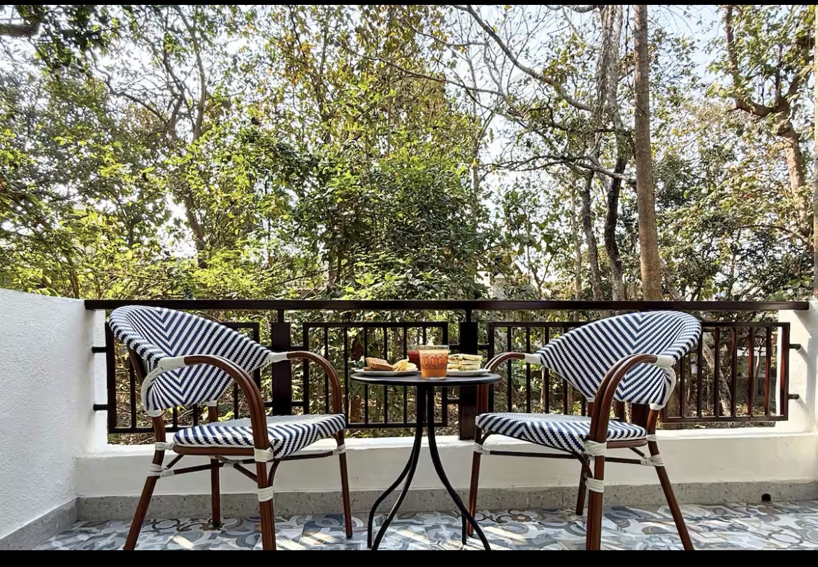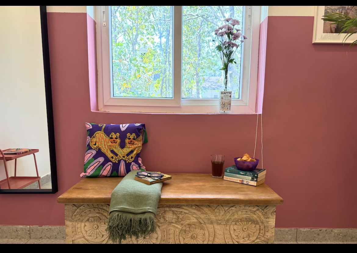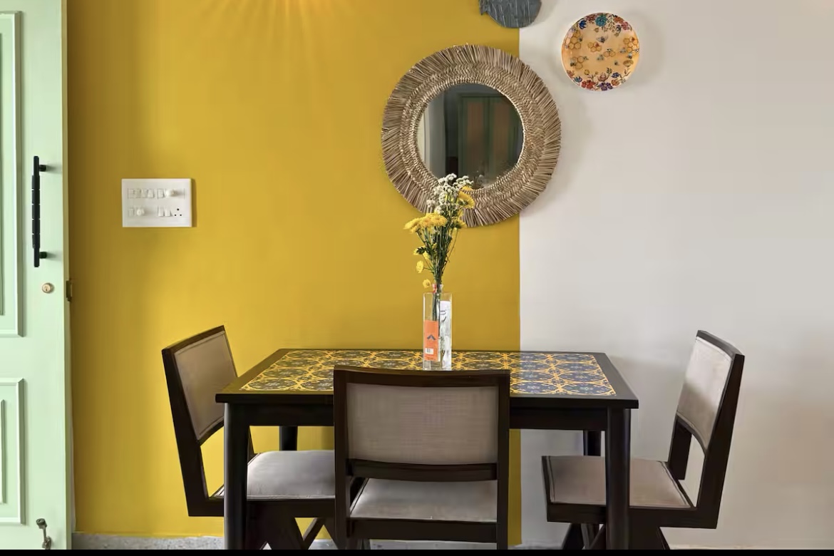 Dream-Chill-Soak-Unwind! A sun-kissed sanctuary where light lingers, breezes whisper, and warmth feels like home. Bright days turn into cosy evenings, with pretty lights adding charm. The airy living space has plants, a TV, AC, high-speed WiFi, and all the essentials. Set in a beautiful apartment complex with lush trees and a serene pool, The Beehive offers a peaceful escape while keeping you close to Goa’s vibrant charm.The bedroom is calm & tranquil with a beautiful view out the window.
